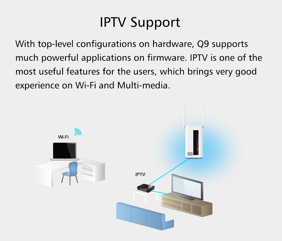 - Supports DHCP, Static IP, PPPoE, PPTP and L2TP broadband functions.