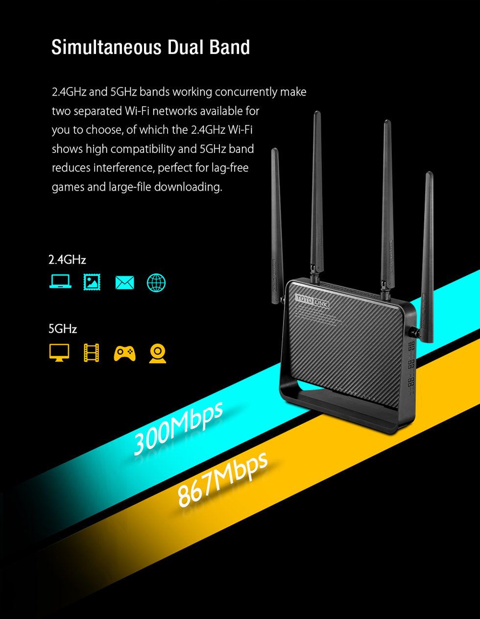 - 867Mbps on 5GHz and 300Mbps on 2.4GHz band for total 1167Mbps simultaneously.
